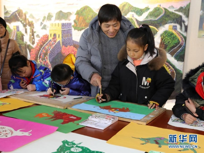 新華社電訊 記者郭斌 攝 2021年1月4日,在浙江省諸暨市陶朱街道三都農(nóng)民畫館,農(nóng)民畫家指導(dǎo)三都小學(xué)美術(shù)社團(tuán)學(xué)生畫農(nóng)民畫。