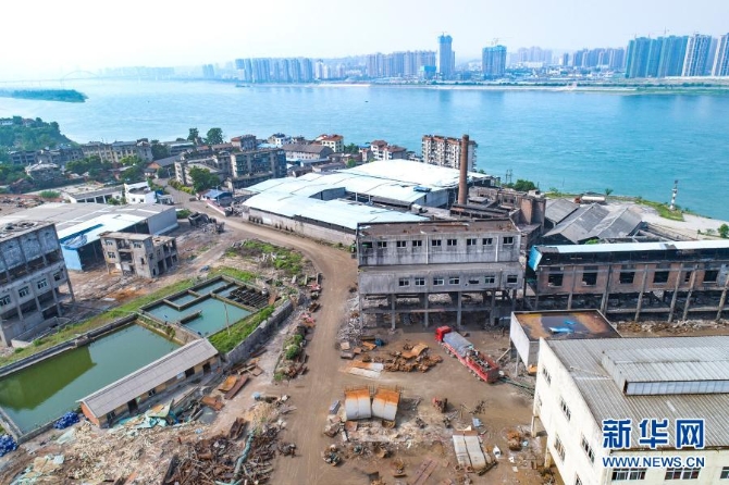 這是2018年4月30日拍攝的湖北宜昌田田化工有限責(zé)任公司拆除現(xiàn)場(chǎng)(無(wú)人機(jī)照片)。新華社記者 肖藝九 攝