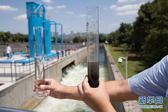 一名工作人員在重慶市南岸區(qū)雞冠石污水處理廠(chǎng)出水口比較污水和出水的不同水質(zhì)(2018年7月28日攝)。重慶市南岸區(qū)雞冠石污水處理廠(chǎng)位于長(zhǎng)江南岸,在保護(hù)長(zhǎng)江環(huán)境中扮演著重要角色。新華社記者 金立旺 攝