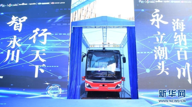 作為2020線(xiàn)上中國(guó)國(guó)際智能產(chǎn)業(yè)博覽會(huì)系列活動(dòng)之一,百度與金龍客車(chē)聯(lián)合研發(fā)的L4級(jí)自動(dòng)駕駛中巴在重慶市永川區(qū)首發(fā)(2020年9月17日攝)。新華社記者 王全超 攝