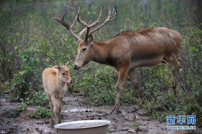這是在湖南洞庭湖麋鹿和鳥(niǎo)類(lèi)救護(hù)避難所拍攝的被救助的麋鹿“犇犇”(右)和一只小麋鹿(2018年5月23日攝)。新華社記者 李尕 攝