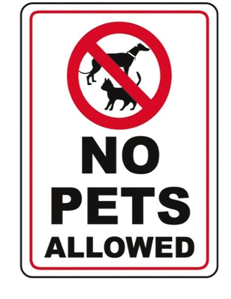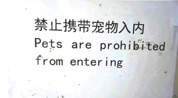 改正:建議將此處提示的英文譯文改為No Pets Allowed(見下圖)。這一譯法以最短的句子清晰地傳達了信息,也符合《公共場所通用標識的英文譯法》提供的英文名稱。