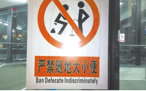 例子:以上圖片是在昆明1、2號地鐵線各站口都能見到的中英文雙語標識。課題組成員認為其英文翻譯存在3個主要問題:其一是ban(禁止)的施動者此處不明確,所以即使用ban也應該首先考慮使用被動語態(tài)。其二,ban和defecate (排便)搭配不當,因為ban之后跟的動詞應該用ing形式,如MPs voted to ban hunting(議員投票禁止打獵),此處翻譯明顯不符合英語語法。其三,也是最重要的一點,該譯文用詞復雜晦澀、艱深難懂,使用者必須推測其意義,有時還會造成理解錯誤,適得其反。