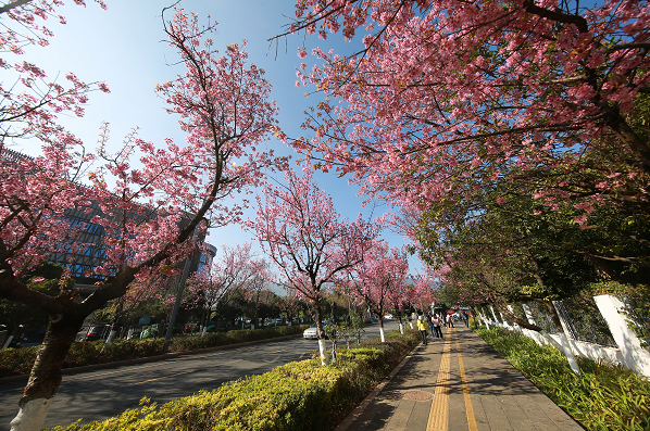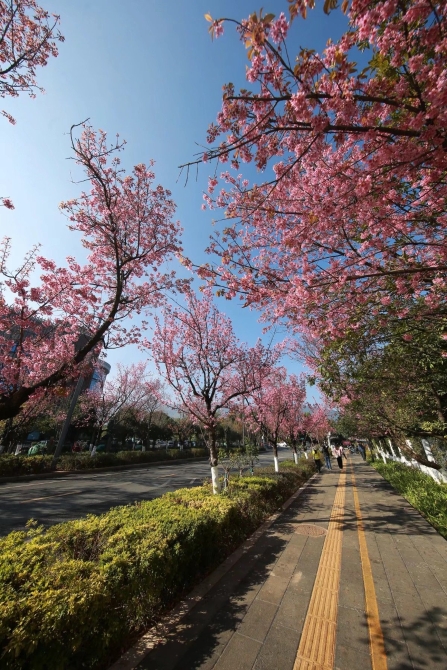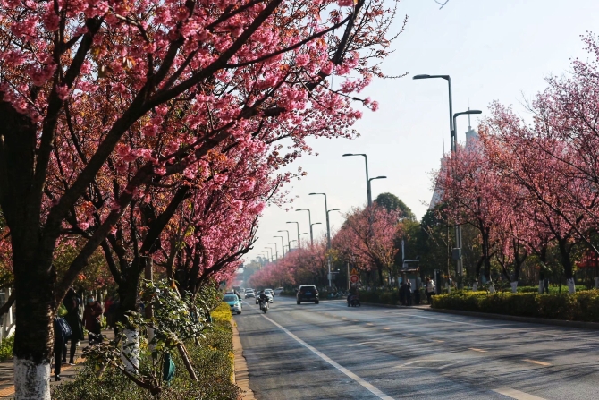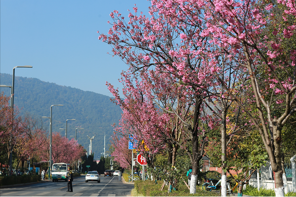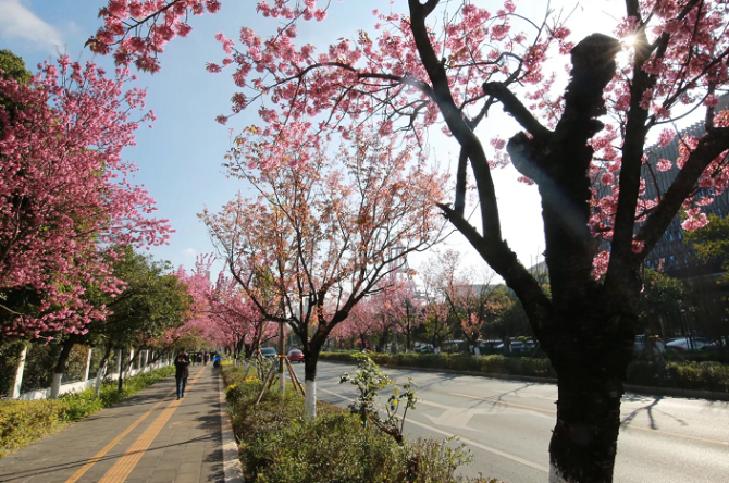 據(jù)度假區(qū)城市管理局園林綠化科科長魯建平介紹,度假區(qū)紅塔西路冬櫻花最早作為行道樹種植是在上世紀80年代,于2000年修建紅塔西路時進行了規(guī)范種植,按照3米的植株間隔進行栽種。經(jīng)過30多年的生長,紅塔西路已漸成為昆明市民冬季觀賞冬櫻花的一條景觀大道。目前紅塔西路冬櫻花總數(shù)達600余株,胸徑約20多厘米。為營造更加美麗的特色道路景觀,度假區(qū)還于2020年逐步更換了長勢不好的冬櫻花400余株。
