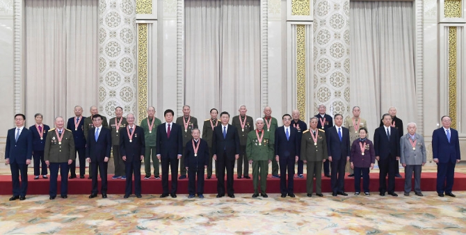 ?↑2020年10月23日,紀念中國人民志愿軍抗美援朝出國作戰(zhàn)70周年大會在北京人民大會堂隆重舉行。會前,習近平等領(lǐng)導(dǎo)同志會見“中國人民志愿軍抗美援朝出國作戰(zhàn)70周年”紀念章獲得者代表,并同大家合影留念。新華社記者 謝環(huán)馳 攝