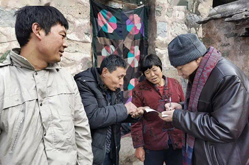 作家關(guān)仁山(右一)在脫貧一線采訪。資料圖片
