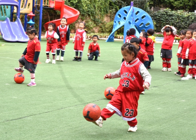 張瑤表示,開(kāi)展足球活動(dòng)首先是普及,抓住3至6歲幼兒的運(yùn)動(dòng)興趣、習(xí)慣、認(rèn)知和技能產(chǎn)生發(fā)展的關(guān)鍵期,尊重規(guī)律,以游戲、興趣為主,廣泛開(kāi)展幼兒足球活動(dòng)。楓林盛景幼兒園與云南志航體育進(jìn)行合作,由他們派駐專(zhuān)業(yè)的教練,利用體能課、課間操等時(shí)間對(duì)所有的孩子進(jìn)行足球基礎(chǔ)教學(xué)活動(dòng),培養(yǎng)孩子們的興趣愛(ài)好。同時(shí),挑選大、中班比較優(yōu)秀的學(xué)生成立由8~9人組成的足球代表隊(duì),利用課余時(shí)間訓(xùn)練,并參加各類(lèi)比賽。同時(shí),幼兒園要求老師不僅要進(jìn)行學(xué)習(xí)足球的相關(guān)知識(shí),還要應(yīng)用到實(shí)際教學(xué)活動(dòng)中,一起和教練磨課,研課,設(shè)計(jì)出了符合幼兒身心特點(diǎn)的足球活動(dòng),營(yíng)造濃厚的足球文化。