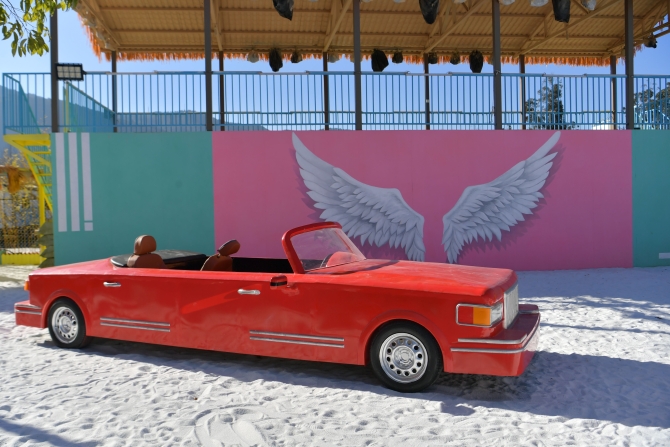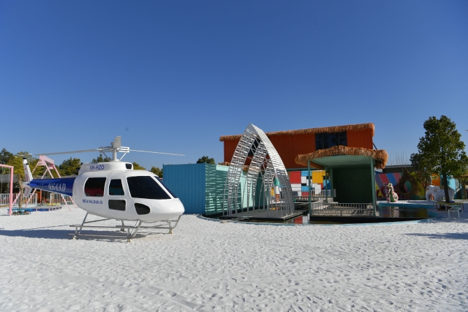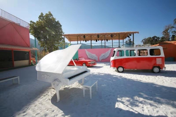“繽紛海埂”分兩大特色體驗區(qū),其一是白色沙灘主題樂園,沙灘面積2800平米,是昆明屈指可數(shù)的白色沙灘主題樂園。為打造白沙灘,專程從省外運了400多噸白沙來。在這里游玩,不僅可以在“天空之鏡”拍攝美照;白沙上還布置了海之禮堂、水幕秋千,以及直升機(jī)、跑車、鮮花裝點的高跟鞋、鋼琴、天使翅膀等拍攝道具和景觀;來到一棟粉紅色3層樓的屋頂,這里也有“天空之鏡”,在昆明的藍(lán)天白云之下,可以拍出有倒影的美照,也可以俯瞰滇池,還有微縮版的“鳥巢”……白沙灘區(qū)域移步易景,每一處都是網(wǎng)紅拍攝打卡地,也是小朋友的樂園。