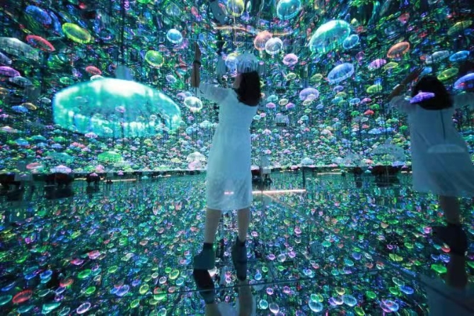 進(jìn)入最后一個館“無限深海探險”,一個個七彩燈盞仿佛海下的水母在游動,當(dāng)你靠近燈盞時,繽紛的色彩遂不及防地涌向你的雙眼,讓人不忍離去,只想讓血液在身體里安靜地沸騰。