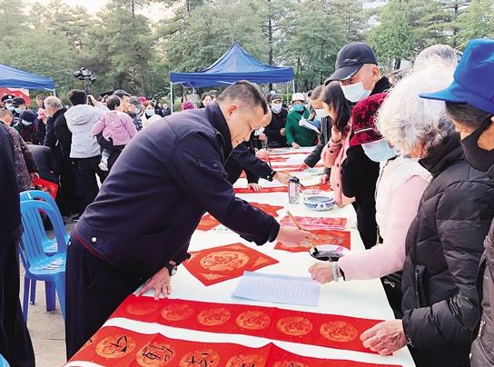 現(xiàn)場(chǎng),墨香飄逸,人頭攢動(dòng)。一張張象征喜氣吉祥的紅紙鋪散開來(lái),一筆筆蒼勁有力的“祝?!避S然紙上,一副副飽含紙墨清香、新年祝福的春聯(lián),在警官們的筆下片刻生成,帶著西山分局民警濃濃的關(guān)懷和深情的祝福,送到轄區(qū)居民手中。