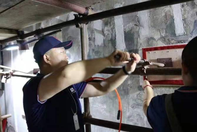 沒(méi)有美術(shù)和雕塑功底就拜師學(xué)基礎(chǔ),沒(méi)有工具就自己造,沒(méi)有技術(shù)就自己研究。就這樣,李云鶴一點(diǎn)一點(diǎn)摸索,制作出原創(chuàng)的“修復(fù)套裝”:最小的醫(yī)用注射器、包裹綢布的棉球、專用的修復(fù)刀、洗耳球、除塵器……他還開(kāi)拓出“空間平移”“整體揭取”“掛壁畫(huà)”等眾多國(guó)內(nèi)首創(chuàng)的壁畫(huà)修復(fù)技法。