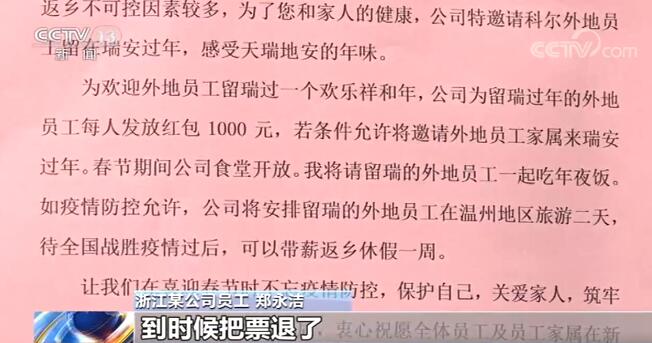 浙江省日前要求各地根據(jù)生產(chǎn)經(jīng)營實際,鼓勵企業(yè)采取發(fā)放“留崗紅包”、改善就餐條件等措施吸引外地員工盡量留在當?shù)剡^年。瑞安的一家企業(yè)將為留在瑞安過年的員工每人發(fā)放1000元紅包,疫情穩(wěn)定后員工可錯峰回家,報銷車費的同時還給員工一周的帶薪休假。