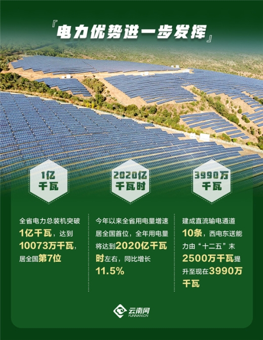 2020年深冬時(shí)節(jié),云南大地連日陽(yáng)光明媚。世界第七大水電站烏東德電站的主要送出“大動(dòng)脈”——烏東德電站送電廣東廣西特高壓多端柔性直流示范工程提前半年投產(chǎn)送電,為粵港澳大灣區(qū)經(jīng)濟(jì)社會(huì)發(fā)展送去源源不絕的“生態(tài)電”;珠江源頭曲靖,曾經(jīng)的荒灘變身為現(xiàn)代工業(yè)園區(qū),綠色鋁、綠色硅產(chǎn)業(yè)發(fā)展步伐加快;綿延不絕的群山之巔,一座座風(fēng)車迎風(fēng)而立,轉(zhuǎn)出勃勃生機(jī)……因水而興的綠色水電、高速旋轉(zhuǎn)的風(fēng)力發(fā)電、熾熱光照下的光伏發(fā)電、綿延的油氣管線,共同織出一張綠色能源大網(wǎng),為經(jīng)濟(jì)高質(zhì)量發(fā)展提供著強(qiáng)大動(dòng)能。