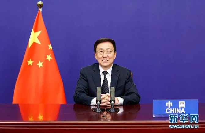 1月11日,中共中央政治局常委、國務(wù)院副總理韓正在北京以視頻方式出席“一個星球”峰會并發(fā)表講話。新華社記者 黃敬文 攝