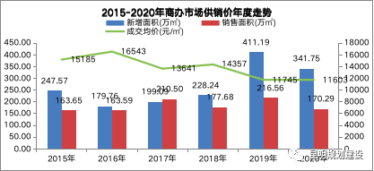 2020年商辦市場供應(yīng)341.75萬㎡,成交170.29萬㎡,市場均價(jià)11603元/㎡,供求比約2.0,市場整體供大于求;同比2019年新增供應(yīng)下跌17%,銷售面積下跌21%,成交均價(jià)下跌1%,受市場存量及需求飽和的影響,供、銷、價(jià)均有所下跌。