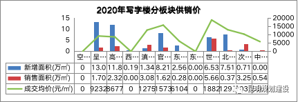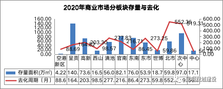 2020年辦公市場官南、呈貢和東南板塊供應(yīng)量最多,呈貢、高新、官南板塊成交量較高,呈貢、東南和官南板塊存量面積最大,世博板塊去化周期最長。