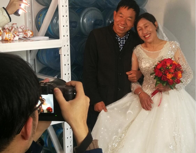 拍攝現(xiàn)場,高瓊仙害羞地接受著志愿者們的化妝,并穿上了專門為她定制贈送的婚紗、頭飾、紅鞋。聽著老伴楊忠華念著蔡崇信公益基金會專門設(shè)計(jì)制作的520明信片上,一個(gè)個(gè)阿里巴巴志愿者寫上的祝福語,高瓊仙臉上洋溢著幸福的笑容,自言自語地重復(fù)一句話:“嫁給老師對,嫁給楊老師真好!”