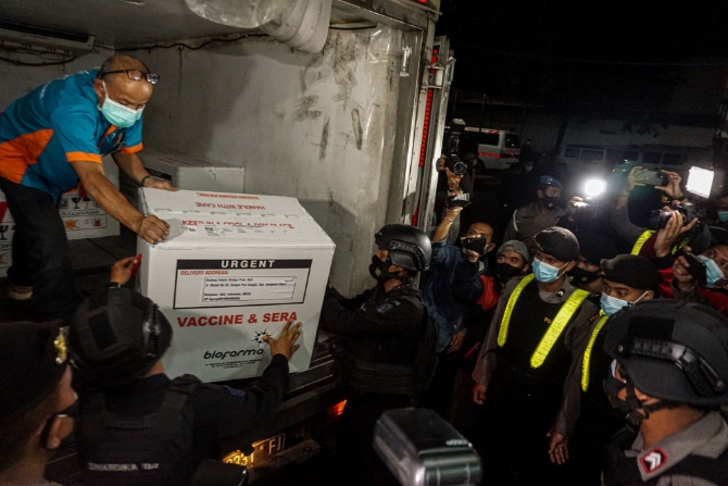 1月5日凌晨,在印度尼西亞巴厘省登巴薩市,人們搬運(yùn)剛剛運(yùn)抵的新冠疫苗。自1月4日起,印尼衛(wèi)生部開(kāi)始向全國(guó)34個(gè)省級(jí)行政區(qū)分發(fā)由中國(guó)科興公司研制的新冠疫苗。新華社發(fā)(比興拉辛攝)