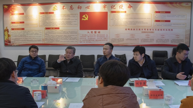 雙方領(lǐng)導(dǎo)聽取高新區(qū)孵化區(qū)管理中心內(nèi)企業(yè)——昆明東電科技有限公司相關(guān)負(fù)責(zé)人介紹公司情況。實(shí)習(xí)生張楊/攝