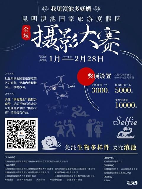 本次大賽以“關(guān)注生物多樣性,關(guān)注滇池”為主題,旨在為即將在昆明舉辦的聯(lián)合國(guó)生物多樣性大會(huì)(COP15)收集和提供滇池周邊環(huán)境樣本實(shí)景。要求參賽作品以反映滇池生態(tài)建設(shè)、自然風(fēng)光、人文風(fēng)情、歷史變遷和經(jīng)濟(jì)社會(huì)發(fā)展成就為題材,充分展示滇池經(jīng)濟(jì)社會(huì)發(fā)展、生態(tài)文明建設(shè)的成果和高原湖濱度假休閑勝地的風(fēng)采。