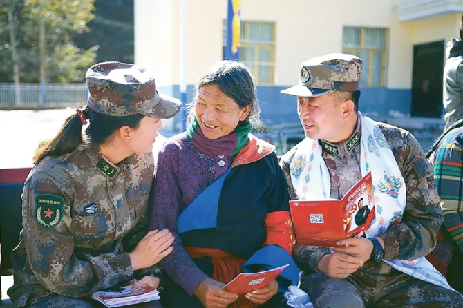 ?軍隊在參與脫貧攻堅中,堅持進村入戶宣傳黨的惠民富民政策,傳遞黨的聲音,引導群眾堅定聽黨話、跟黨走、脫貧困、奔小康。圖為2018年10月,青海省軍區(qū)藏漢雙語小分隊深入藏鄉(xiāng)牧區(qū)宣傳黨的創(chuàng)新理論和惠民政策。 中央軍委政治工作部供圖