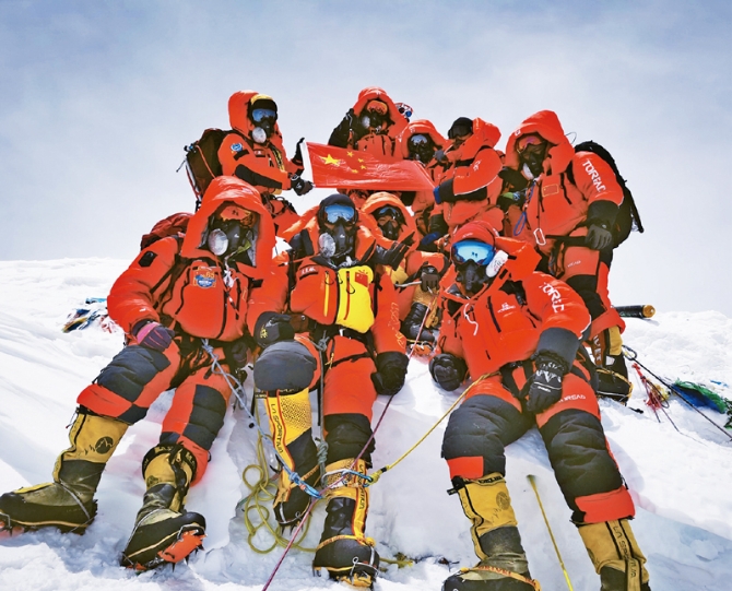 精確測量珠穆朗瑪峰的高程具有重要科學(xué)價值,是國家測繪技術(shù)水平和能力的綜合體現(xiàn)。2020珠峰高程測量登山隊最終確定珠穆朗瑪峰的最新高程為8848.86米。圖為2020年5月27日,登山隊在珠穆朗瑪峰頂合影留念。 新華社特約記者 扎西次仁/攝