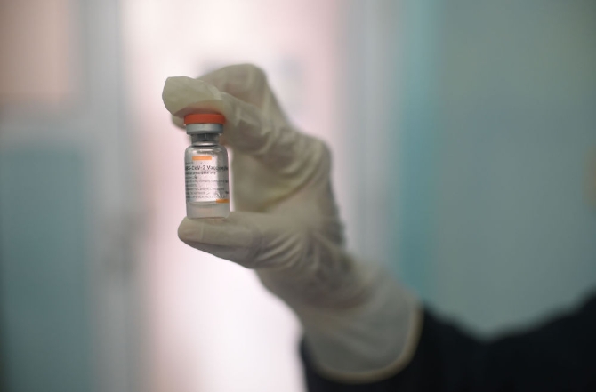 ↑1月15日,在印度尼西亞萬丹省南唐格朗,醫(yī)務(wù)人員展示中國科興公司的克爾來福新冠疫苗。