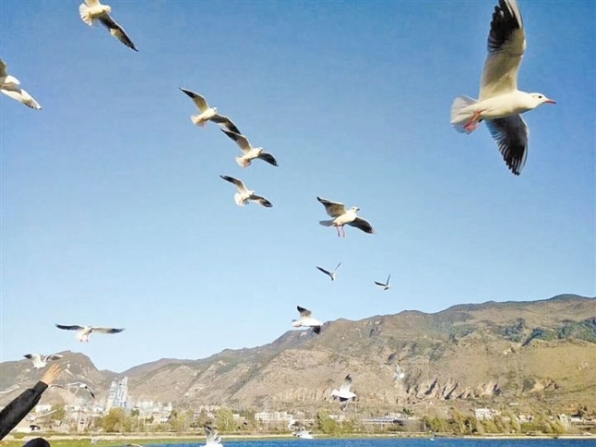 月牙湖濕地公園位于宣威市區(qū)南部。近年來,隨著生態(tài)環(huán)境不斷改善,越來越多的海鷗光臨這里越冬,它們當(dāng)年11月飛到月牙湖濕地公園,次年3月便會離開。月牙湖附近居民繆彩春介紹:“來月牙湖的海鷗有紅嘴鷗、黑尾鷗,還有一種頭戴‘黑帽’的海鷗,要到過年的時(shí)候才來?!睋?jù)了解,海鷗一般以小魚和其他水生生物為食,分布在歐洲、亞洲及北美洲,每年冬季,它們會不遠(yuǎn)萬里選擇適宜的地方越冬。