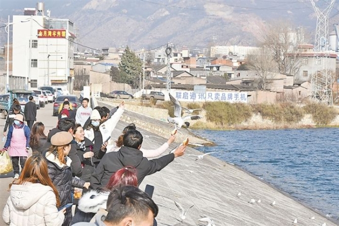 1月12日,暖陽高照,記者在曲靖宣威市月牙湖濕地公園看到,成群的游客聚集在大壩上觀看海鷗。上千只海鷗在湖面的上空飛翔著,游客投食時(shí)它們便爭先恐后地向岸邊飛來,有的海鷗則浮游在水面上覓食。