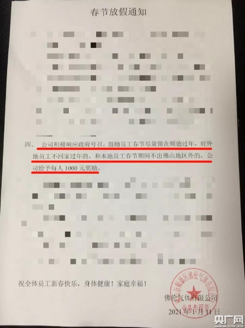 佛山順德一家企業(yè)推出暖心舉措,“真金白銀”獎(jiǎng)勵(lì)留在本地過(guò)年的員工(央廣網(wǎng)發(fā) 受訪者供圖)