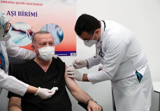 1月14日,土耳其總統(tǒng)埃爾多安在安卡拉一家醫(yī)院接種中國科興公司研發(fā)的新冠疫苗。