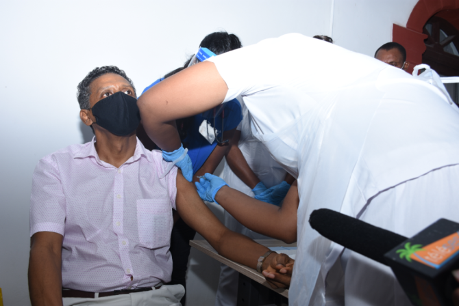 2021年1月10日,塞舌爾總統(tǒng)拉姆卡拉旺在位于塞首都維多利亞的一個(gè)疫苗接種點(diǎn)接種新冠肺炎疫苗。
