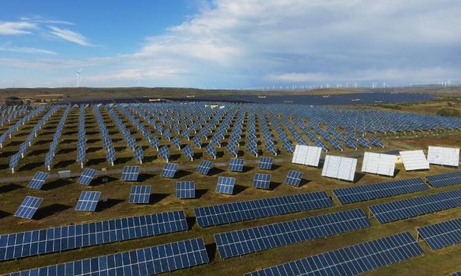 張家口市張北縣大河鄉(xiāng)國(guó)家風(fēng)光儲(chǔ)輸示范基地的光伏發(fā)電站和風(fēng)電場(chǎng)遙相呼應(yīng)(9月15日無(wú)人機(jī)拍攝)。新華社記者楊世堯攝