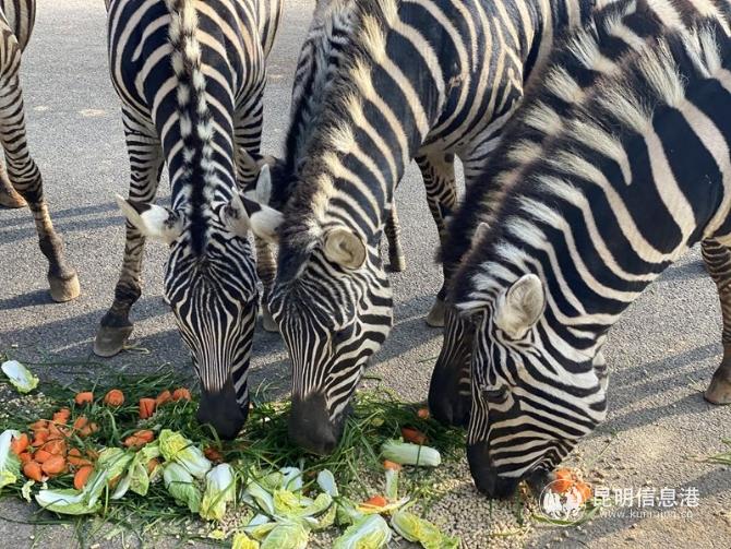 在園區(qū)內(nèi),有兩只新出生的小斑馬,還不足一個(gè)月。為了讓它們感受到新年的氣氛,在新的一年里茁壯成長(zhǎng),工作人員特意在其食物中添加了胡蘿卜、白菜、特制飼料等,再配上青草送給了新出生的兩只小斑馬和斑馬媽媽。