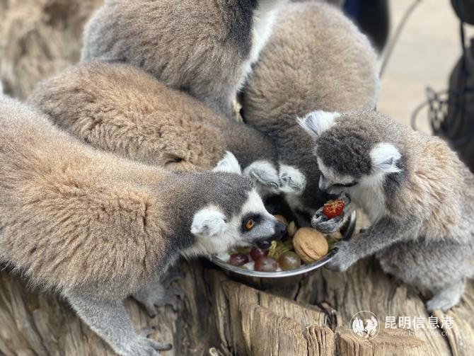 環(huán)尾狐猴的“臘八粥”大餐則有葡萄干、紅棗、開(kāi)心果等定制食材。在制作“臘八粥”時(shí),環(huán)尾狐猴們就迫不及待開(kāi)始吃起來(lái)。當(dāng)把“臘八粥”做好放到它們面前后,小動(dòng)物們立馬大吃特吃起來(lái)。