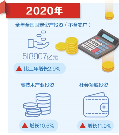 受新冠肺炎疫情沖擊,2020年1月份至2月份全國固定資產(chǎn)投資大幅下降24.5%,而后降幅逐月收窄,上半年下降3.1%,至前三季度增速實(shí)現(xiàn)由負(fù)轉(zhuǎn)正。全年投資比上年增長2.9%,增速比1月份至11月份和前三季度分別加快0.3和2.1個(gè)百分點(diǎn)。