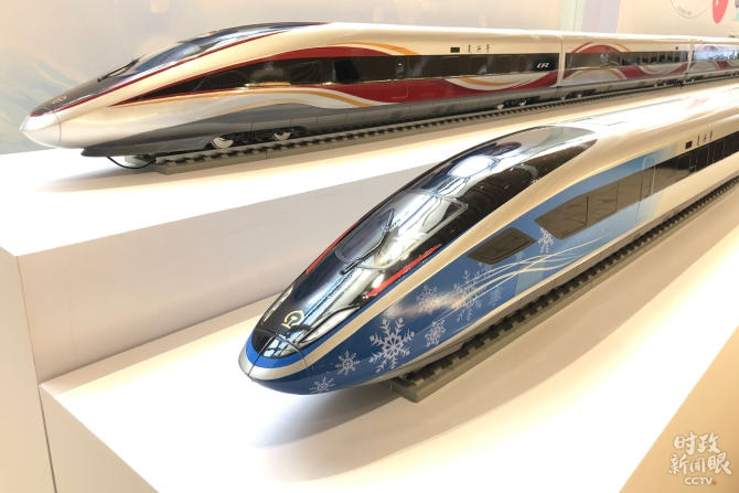 △京張高鐵復(fù)興號智能動(dòng)車組“龍鳳呈祥”和“瑞雪迎春”模型(總臺央視記者許永松拍攝)