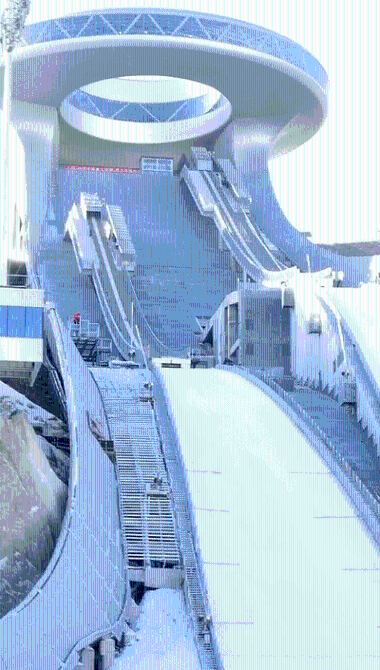 △這是落差為114.7米的標(biāo)準(zhǔn)跳臺滑雪賽道。(總臺央視記者邢彬拍攝)