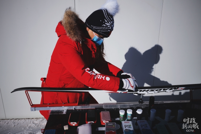 △國家冬季兩項(xiàng)滑雪隊(duì)柳圓圓在為雪板打蠟,打蠟后可以提升30%滑行速度。(總臺央視記者王哈男拍攝)