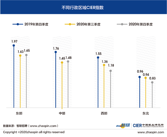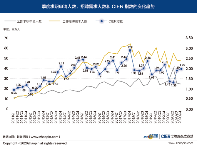 近日,中國人民大學中國就業(yè)研究所與中國領先的職業(yè)發(fā)展平臺智聯(lián)招聘,聯(lián)合發(fā)布2020年第四季度《中國就業(yè)市場景氣報告》,其中指出,四季度就業(yè)市場景氣指數(shù)(CIER)為1.95,高于一季度的1.43、二季度的1.35和三季度的1.89,就業(yè)市場呈現(xiàn)持續(xù)回暖態(tài)勢。