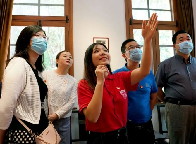 2018年5月,復(fù)旦大學(xué)將陳望道故居改造為《共產(chǎn)黨宣言》展示館,該校一批青年教師和學(xué)生組建黨員志愿服務(wù)隊(duì),面向廣大師生和社會(huì)各界開展宣講活動(dòng)。2020年6月,習(xí)近平總書記給黨員志愿服務(wù)隊(duì)全體隊(duì)員回信,勉勵(lì)他們繼續(xù)講好關(guān)于理想信念的故事。圖為志愿服務(wù)隊(duì)隊(duì)員(中)在為觀眾講解。新華社記者 劉穎/攝