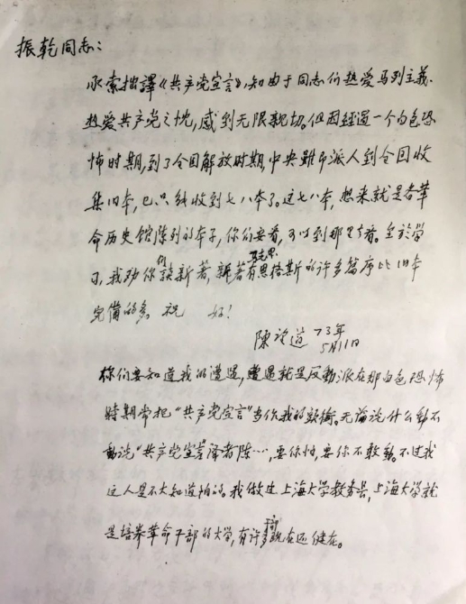 這是陳望道寫給鄭振乾的信件(資料照片),他在信中寫道:“你們要知道我的遭遇,遭遇就是反動(dòng)派在那白色恐怖時(shí)期常把‘共產(chǎn)黨宣言’當(dāng)作我的頭銜……要你怕,要你不敢動(dòng)。不過我這人是不大知道怕的?!?新華社發(fā)