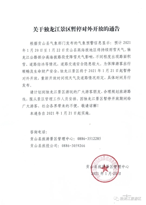 昆明信息港訊 實習記者鄧國梅 1月20日,貢山縣旅游景區(qū)管理中心發(fā)布通告,受于天氣影響,貢山縣出現(xiàn)不同程度路面積雪、道路結(jié)冰等情況,道路交通安全隱患較大,為保障游客出行順暢及生命財產(chǎn)安全,獨龍江景區(qū)于1月21日起暫停對外開放,重新開放時間視天氣及道路情況而定,具體時間另行發(fā)布。