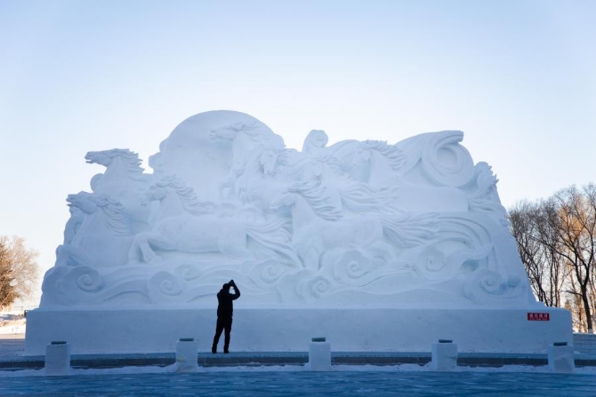 雪雕與周邊建筑、燈飾亮化有機結(jié)合。市民可近距離欣賞雪雕藝術(shù),感受冰雪文化。
