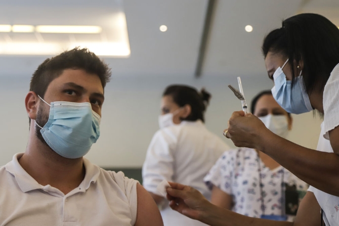 1月19日,在巴西圣保羅,一名醫(yī)務(wù)人員接種中國新冠疫苗。新冠疫情持續(xù)蔓延,中國新冠疫苗為許多國家和地區(qū)抗擊疫情提供助力、注入信心。新華社發(fā)(拉赫爾·帕特拉索攝)