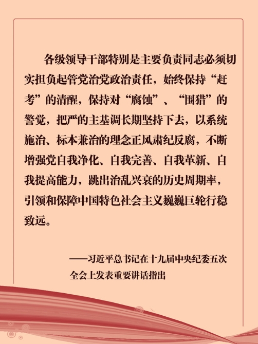 腐敗問題的背后,往往有政治問題,政治腐敗是最大的腐敗。全面從嚴(yán)治黨首先要從政治上看,不斷提高政治判斷力、政治領(lǐng)悟力、政治執(zhí)行力。只有從政治上看明白、悟透了全面從嚴(yán)治黨和反腐敗的本質(zhì),才能有堅持下去的政治決心和政治定力,贏得這場輸不起也決不能輸?shù)亩窢?。要?yán)明政治紀(jì)律和政治規(guī)矩,及時把“兩面派”“兩面人”辨別出來、清除出去,消除重大政治隱患。要以強有力的政治監(jiān)督,確保黨中央重大決策部署貫徹落實到位。黨員、干部要筑牢思想防線,時刻自重自省自警自勵,慎獨慎微慎始慎終,做政治信念堅定、遵規(guī)守紀(jì)的明白人。