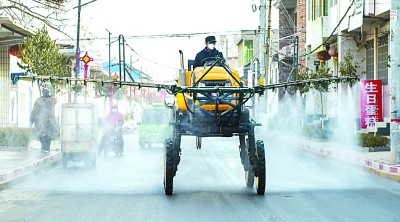 1月15日,工作人員使用農(nóng)用噴霧機(jī)對(duì)石家莊市藁城區(qū)禪房村進(jìn)行全面消殺。趙杰攝/光明圖片