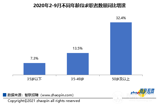 報告揭示,2020年2-9月在智聯(lián)平臺投遞簡歷的35歲及以上求職者同比增長14.9%,而35歲以下求職者同比增長僅為7.3%;其中,35-49歲中高齡求職者同比增長13.5%,50歲及以上中高齡求職者同比增長32.4%。根據(jù)問卷調(diào)查,疫情期間因單位倒閉、停產(chǎn)或歇業(yè)導(dǎo)致的中高齡勞動者再就業(yè)的比重為25.3%,新冠肺炎疫情是前三季度中高齡求職者規(guī)模高于往年的最主要外生變量。