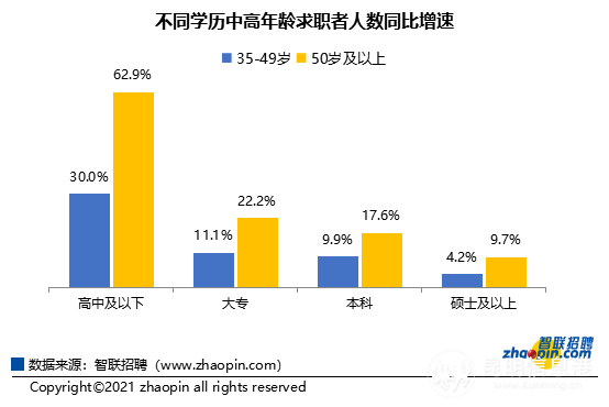 這個期間,35-49歲高中及以下學(xué)歷的中高齡求職者人數(shù)較去年同期增長30.0%,50歲及以上則增長62.9%,明顯高于有大專及以上學(xué)歷求職者的同期增幅。在中高齡求職者投遞簡歷的崗位中,學(xué)歷要求在高中及以下的比重上升了9.7%,招聘人數(shù)較多且增長相對較快的是技工/操作工,中高齡求職者可選擇崗位的質(zhì)量并不高。
