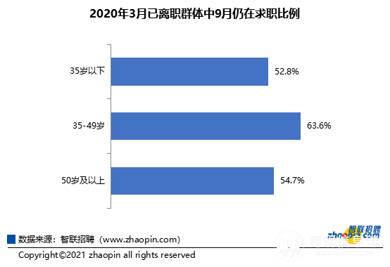 2020年3月已離職的35歲及以上求職群體中,到9月份仍有62.9%繼續(xù)在智聯(lián)平臺投遞簡歷,失業(yè)時間超過半年。其中35-49歲和50歲及以上群體的比例,分別為63.6%和54.7%。